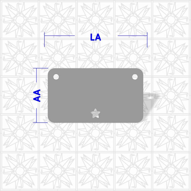 Placa retangular com cantos arredondados, dois furos e estrela vazada